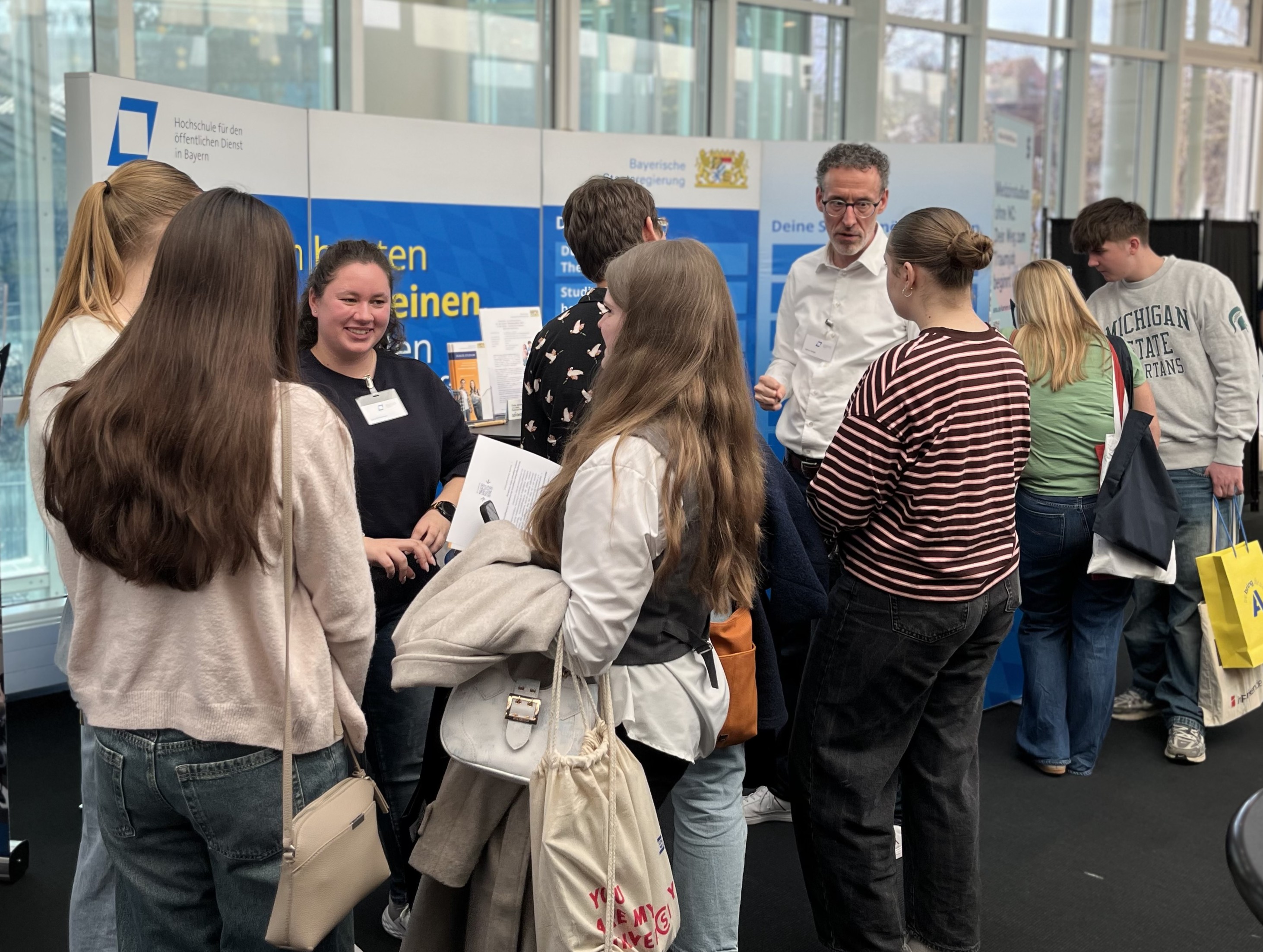 Am 28. Februar eröffneten wir unsere Messe-Tour 2026 mit einem gelungenen Auftakt in der Konzerthalle Bamberg. Auf der Studienmesse haben wir zahlreiche Interessierte aus der Region beraten, über den LPA-Test und die Möglichkeiten eines dualen Studiums beim Staat informiert. Besonders gefreut hat uns das große Interesse an den Studienabläufen und unseren zehn Standorten. Neben gezielten Beratungsgesprächen gab es natürlich auch Raum für den lockeren Austausch rund um den öffentlichen Dienst in Bayern.
